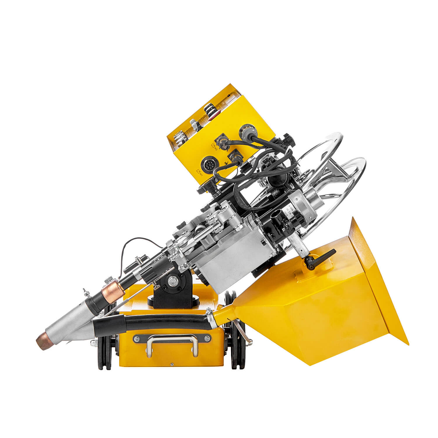 MZ 1250 HD-V состоит из инверторного источника питания и передвижной каретки, на которой установлен механизм подачи проволоки, бункер с флюсом и блок управления. Оборудование в процессе работы передвигается по изделию или по уложенной на нем направляющей линейке, а постоянный полный привод колес каретки обеспечивает ровный ход и устойчивое положение по всей траектории перемещения, как на ровных, так и на наклонных поверхностях.